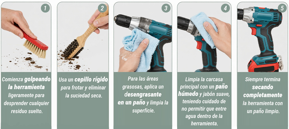 El método dependerá de la herramienta y del tipo de suciedad. Siempre desconecta la herramienta o retira la batería antes de comenzar.